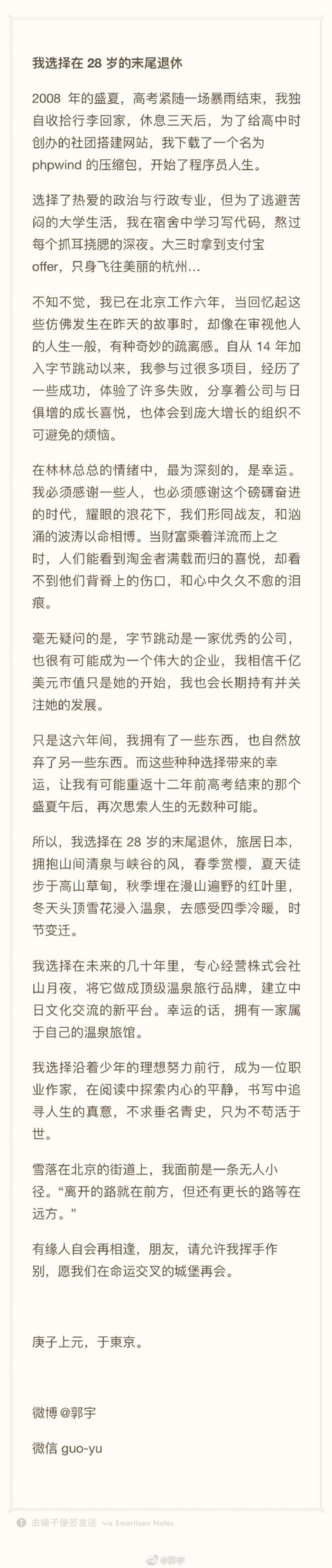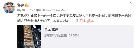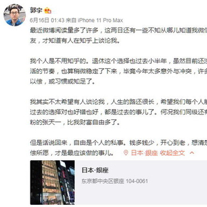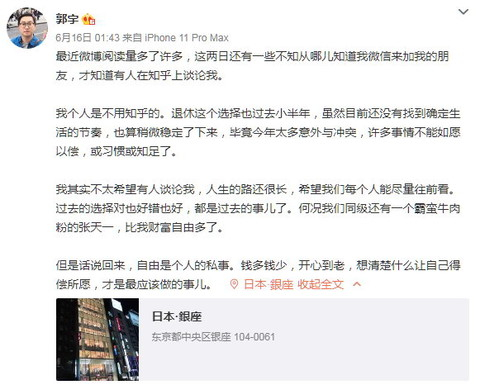 关注到知乎有网友在谈论自己,郭宇在个人微博回应道:“我其实不太希望有人谈论我,人生的路还很长,希望我们每个人能尽量往前看。过去的选择对也好错也好,都是过去的事儿了。何况我们同级还有一个霸蛮牛肉粉的张天一,比我财富自由多了。”