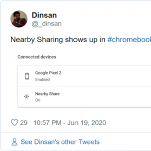 虽然谷歌的文件共享服务最初被称为Fast Share,但在开发过程的后期其最终被重新命名为Nearby Share。根据最近在Chromium Gerrit中提交的一些信息显示,Nearby Share可以在所有安装了Chrome的电脑上运行。现在,Nearby Share选项已经出现在chromebook上,这进一步暗示了谷歌将使用Chrome为Android设备带来附近共享功能。