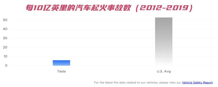 由于公众的误解,特斯拉决定开始每年公布车辆火灾数据。从2012年到2019年,特斯拉每行驶1.75亿英里发生一次起火事故。相比之下,美国国家消防协会(NFPA)和美国交通部的数据显示,在美国,每行驶1900万英里就会发生一次燃油车起火。