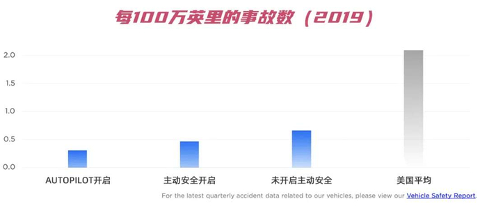 2019年,在美国,一辆参与自动驾驶的特斯拉汽车每行驶100万英里发生0.3起事故,而美国的平均水平则高出约6倍,平均每100万英里2起事故。即使在只启用主动安全功能的情况下,特斯拉车辆在2019年的碰撞率也比美国平均水平低4.5倍。
