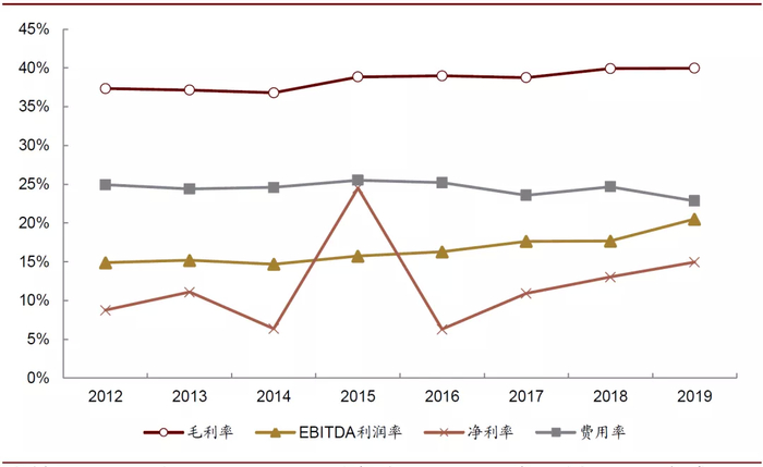 2012-2019年,公司毛利率与EBITDA利润率稳步提升,费用率稳中有降,净利率由于受收购与出售业务产生非经常性损益存在一定波动性,但整体呈现上升趋势。盈利能力提升的主要原因是:①产品价格的提升;②收购公司发挥协同效应带来的成本削减;③广告宣传费用的管控;④公司对低毛利或亏损业务的剥离。同时公司营运效率在同步提升,应收款周转天数逐步下降而应付款周转天数逐步提高,公司现金循环周期逐步改善。剔除资产收购与出售损益的影响,公司扣非后ROE从2012年的4.3%提升至2019年的14.9%,其中2015-2019年实现逐年稳定上升,体现其经营效率提升趋势明显。