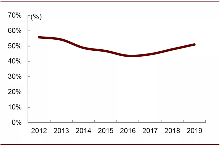 图表: 2010-2019年中国零食市场电商及便利店渠道占比