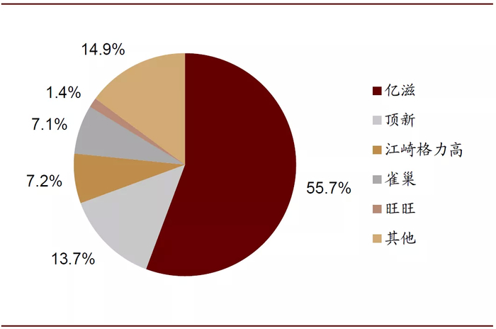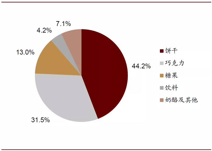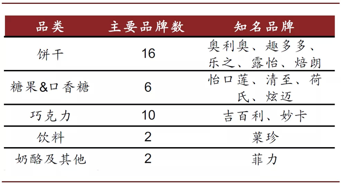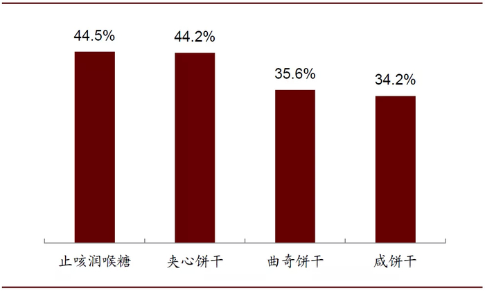 公司通过丰富的子品类构成切入细分市场,以实现对不同消费人群和消费场景的覆盖,例如公司饼干品类包括夹心饼干、牛奶饼干、苏打饼干、五谷早餐饼干等,糖果品类包括太妃糖、口香糖、薄荷糖等。以零食市场发展较为成熟的美国为例,公司在止咳润喉糖、夹心饼干、曲奇饼干、咸饼干等细分品类中均占有1/3以上的市场份额,在优势细分领域中占据绝对领先地位。