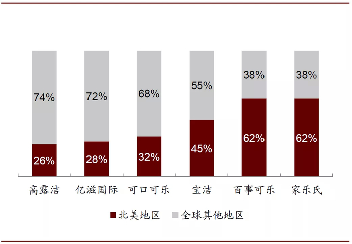 图表: 2019年美国快消品公司北美与其他地区收入占比