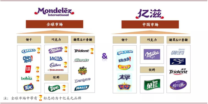 亿滋国际前身卡夫食品的历史包含着一部辉煌的并购史:2001年对纳贝斯克的并购为公司带来了奥利奥、趣多多和乐之等品牌,2007年对达能饼干业务的并购为公司带来了露怡、王子、闲趣、优冠等品牌,而2010年对吉百利的并购为公司带来了怡口莲、荷氏、清至等品牌。对全球优质企业的并购使得公司不断整合行业资源,扩充产品矩阵,拓宽销售渠道,进入新区域新市场以及快速提升份额,也是公司发展壮大、趋向多元化、成为全球零食领先企业的重要战略之一。