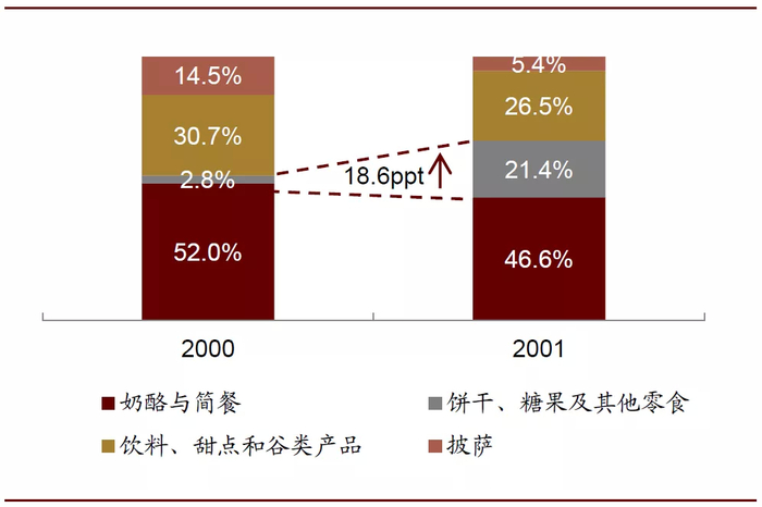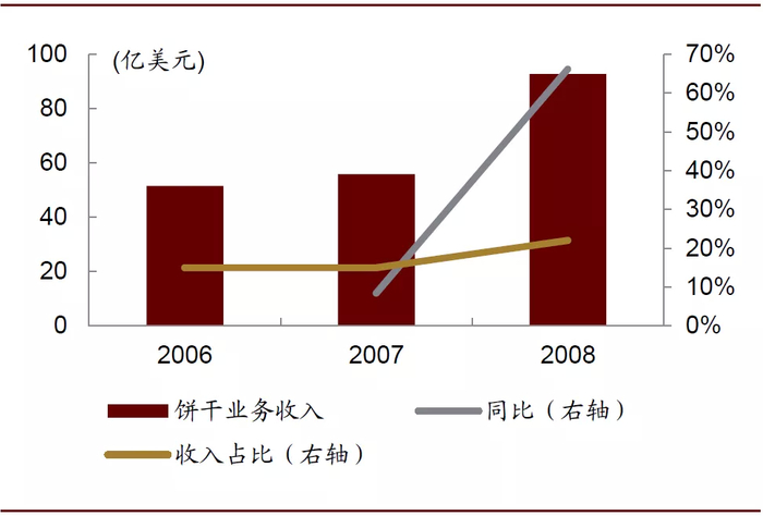 收购前卡夫食品旗下零食业务中主要包括糖果等产品,没有饼干业务。完成对纳贝斯克的并购后,饼干成为了卡夫食品的新业务以及重要业务,2001年占总营收比重达15%。此次收购对公司收入及营业利润亦有增厚,公司总收入/营业利润从2000年的265.3/40.1亿美元提升至2001年的292.3/49.6亿美元,增厚10.2%/23.6%。而在北美本土市场,饼干、糖果和其他零食业务收入从2000年的5.6亿美元提升至2001年的46.8亿美元,扩容7倍以上,占北美总营收的比例也从2.8%迅速提升至21.4%。