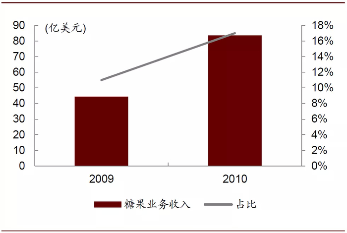 收购吉百利使得公司在糖果业务方面自2004年剥离后一跃成为全球糖果市场份额第一,2010年,卡夫食品在全球糖果行业市占率达到13.5%,超过箭牌母公司玛氏迅速成为行业龙头,同时获得了吉百利的全球工厂以及在200多个国家的销售渠道。2010年亿滋糖果业务收入达到83.7亿美元,较2009年扩大88%,在总收入中的比例也从11%提升至17%。而在卡夫重点拓展的中国市场,吉百利拥有的2家工厂、3家销售及贸易公司和1996年进入中国的荷氏、怡口莲等品牌也为公司提供了良好的助力。