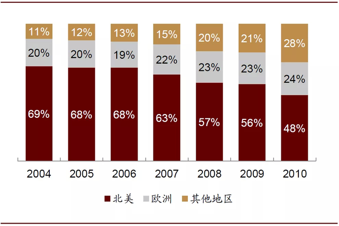 图表: 卡夫食品各地区收入占比(2004-2010)