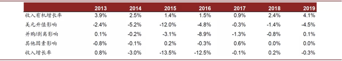 图表: 2013-2019年公司收入有机增长率与影响因素
