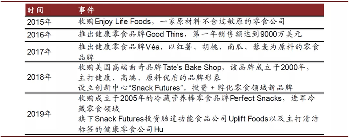 公司开始并购一些“小而美”的公司,包括健康食品品牌、中高端品牌等等,进一步丰富产品结构的同时切入新领域。2015年亿滋国际收购了健康食品公司Enjoy Life Foods,2018年亿滋国际以5亿美元收购主打健康高端的曲奇品牌Tate’s Bake Shop,2019年公司收购冷藏营养棒的先驱品牌Perfect Snacks,开放多元、迎合潮流成为亿滋国际的品牌建设风格。