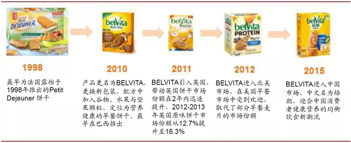 焙朗的前身是1998年法国达能旗下的露怡饼干推出的Petit Dejeuner 饼干,2000年仅在7个欧洲国家售卖,品牌规模较小。2007年卡夫收购达能饼干业务后,充分挖掘产品的营养价值,迎合零食健康化潮流,并改良产品配方与包装,更名为焙朗(belVita)。2010年首先在巴西推出,2011-2015年相继引进英国、北美和中国并迅速收获消费者的喜爱和市场份额的提升。截至目前,焙朗已经成为亿滋旗下引领健康早餐饼干的全球性品牌,拥有20多个品种,并在50余个国家销售。