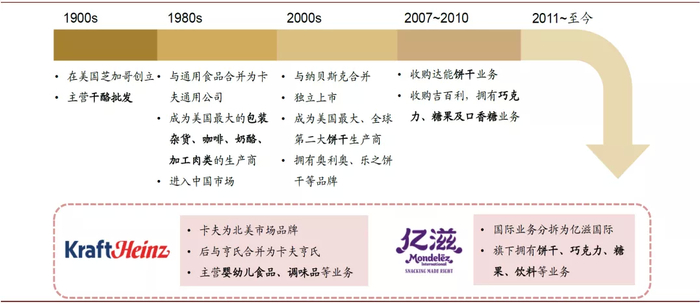亿滋国际源于卡夫食品,卡夫食品成立于1903年,并于1988年被菲利浦莫里斯公司收购,并在此后的20年间通过并购持续扩大品类范围,并在饼干、糖果等领域取得行业领先地位。2012年卡夫食品拆分为两家独立上市公司,面向北美的杂货业务沿用卡夫的名字并于2015年与亨氏合并为卡夫亨氏,面向国际的零食业务成为亿滋国际。
