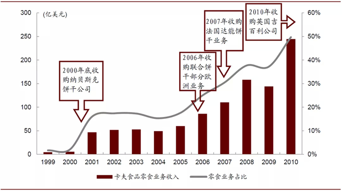 图表: 卡夫食品1999-2010年零食业务收入情况及主要并购事件