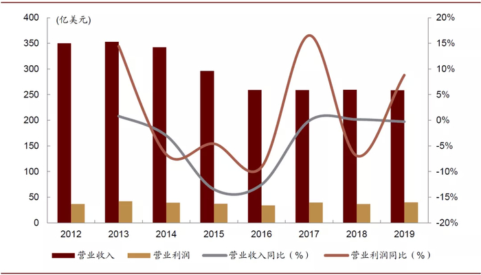 图表: 亿滋国际2012-2019年收入与营业利润情况