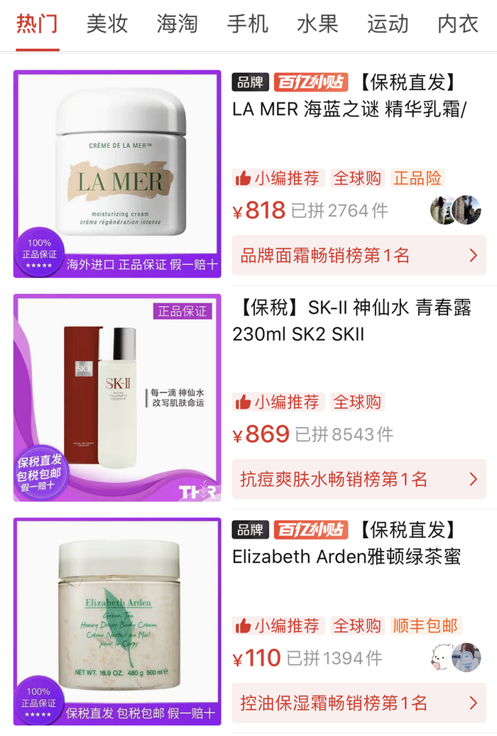 根据官方宣传,拼多多百亿补贴的商品覆盖超过3万款,品牌包括苹果、戴森、Bose、索尼,以及SKII、海蓝之谜等市场定价均在千元以上的轻奢品牌。