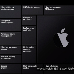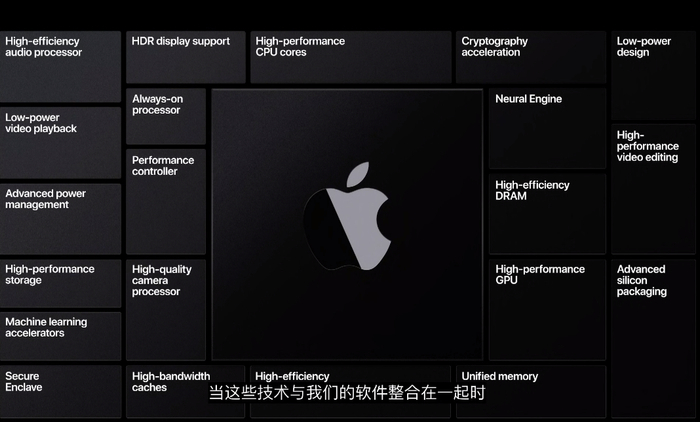 和英特尔芯片相比,采用了ARM架构的苹果自研芯片可以塞入更多的自主定制IP,而且苹果还重点强调了它在性能和功耗上的完美平衡。