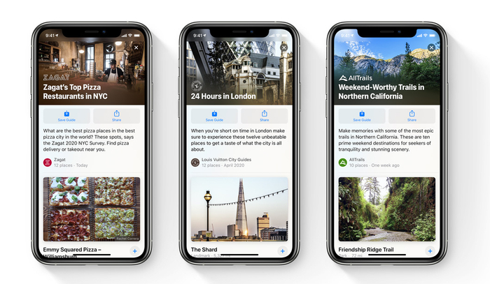 在iOS 14上, 苹果对自带的地图应用进行大幅度的升级。升级后的地图除了基础的步行和驾驶导航功能外,还将支持自行车路线规划。除此以外,苹果似乎还向中国的美团、高德等应用取经,在地图中新增了各类餐饮、购物、旅游场所的介绍和推荐,苹果表示这类内容将会持续保持更新。