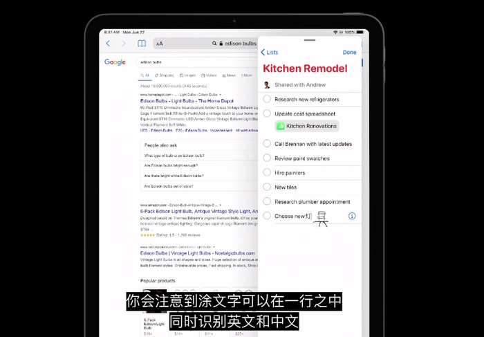 iPadOS 14另一个重大的功能更新,则是针对手写体验的Scribble涂文字功能。涂文字能够通过机器识别将你的手写笔记转换为文本,还可以对手写内容进行圈选关键词、复制粘贴等。在同一行手写输入内容中,涂文字还能够识别多种语言,实现不同语言的混合输入。
