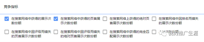 我一般会添加“竞争指标”里面的“在搜索网络中获得的展示次数份额”,这样你就可以看到你的广告排名每天的大概位置变化情况。