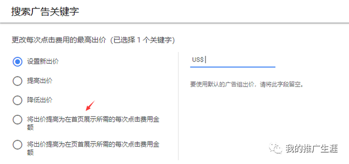 如果我感觉广告没有展示,没有流量,那么可以通过直接给指定的精准关键词修改出价,两种选择“将出价提高为在首页展示所需要的每次点击费用金额”或者“将出价提高为在页首展示所需的每次点击费用金额”。