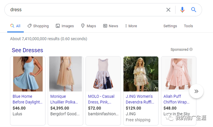 谷歌会先显示购物广告,然后接着才是带有 Ad 标志的搜索广告,为了对比购物和搜索广告之间那个效果增加明显,我这里也对这款产品跑了购物广告。