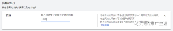 预算,这里要注意下,例如你填写 10 美元每天,每个月的预算就是 300 美元,但是实际的可能会花掉 15 美元,每日的幅度一般不会超过设置好的 150%,同时每个月的预算不会超过 300 美元。