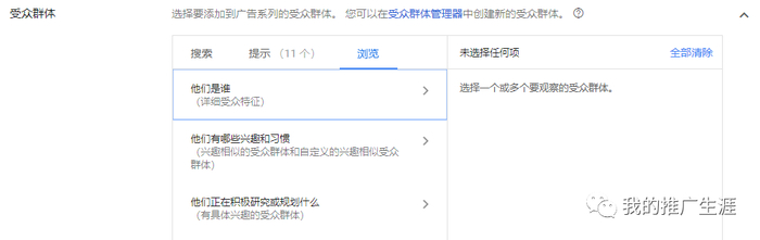 搜索广告的受众群体,不建议使用,比较鸡肋,因为搜索广告都是通过关键词精准定位的,如果使用了受众群体反而会极大的限制了广告的展示机会。