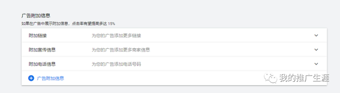 广告附加信息:这个是必须要填写的,可以调高广告点击率,从而提高广告评级,降低 CPC。