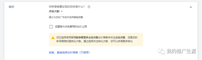出价策略:点击次数、转化价值、转化次数三种选择。