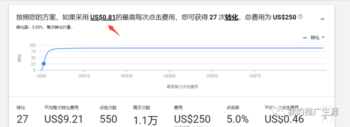 你可以输入“首页低位出价”,然后就可以获取一个预估的转化数据,如下,我这个关键词出价 0.81 美元,然后自己添加转化率为 5%,预估下个月可以获取 27 个转化,平均转化的费用是 9.21 美元。