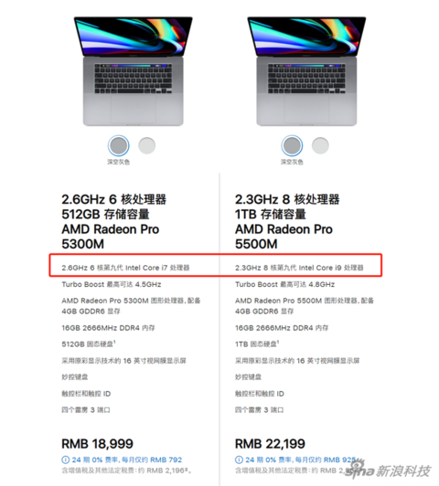 目前官网在售的13英寸MacBook Pro有八代酷睿和十代酷睿两种选择, 16寸的MacBook Pro仍然搭载英特尔第九代酷睿处理器,有趣的是苹果不久前刚刚宣布将MacBook Pro 16的显卡升级为AMD Radeon Pro 5600M,其他不变,而此时性能更好、工艺更先进的同级别十代酷睿处理器已经充斥了整个Windows PC市场。