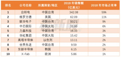 2018年纯晶圆代工企业全球市场销售额排名。来源:新华财经