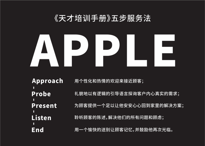 2012年,一家国外的网站无意当中获得了苹果内部的《天才培训手册》,上面谈到了苹果的五步服务法,相信在很多介绍苹果零售的文字中,已经出现了多次: