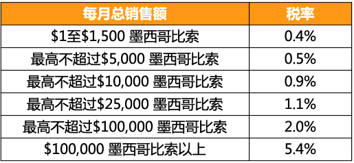 2、如果已注册有效的 RFC ID,是个人注册卖家(自然人),亚马逊将根据卖家的每月总销售额按照 0.4%-5.4% 税率计算所得税,并将这些金额汇给墨西哥税务机构。