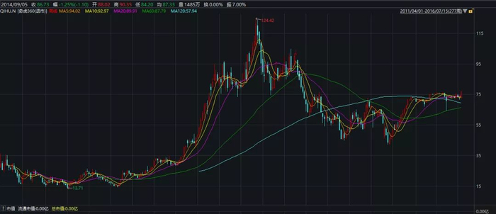 奇虎360在其5年的美股之旅中,上涨最快的是12年8月份至14年3月份,股价从15美元左右,一路上扬至120美元,一年半的时间内上涨了8倍。
