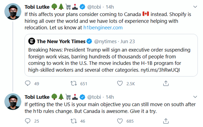 加拿大电子商务软件开发商Shopify CEO托比·卢克(Tobi Lütke)是德国移民。周二早间,卢克在推特上发出邀请,希望想要移民美国的科技工作者可以考虑一下加拿大。