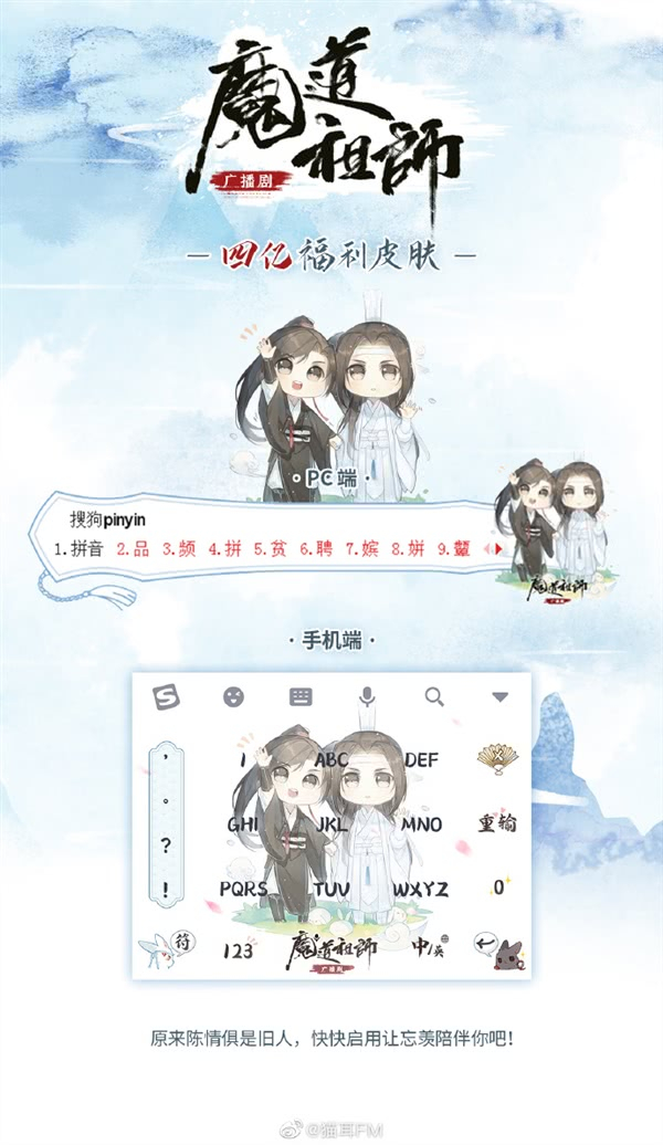 近日,《魔道祖师》广播剧在猫耳FM已拥有4亿播放量,猫耳FM与搜狗输入法合作,推出了一款魔道祖师皮肤,给喜爱魔道祖师的搜狗输入法用户使用。