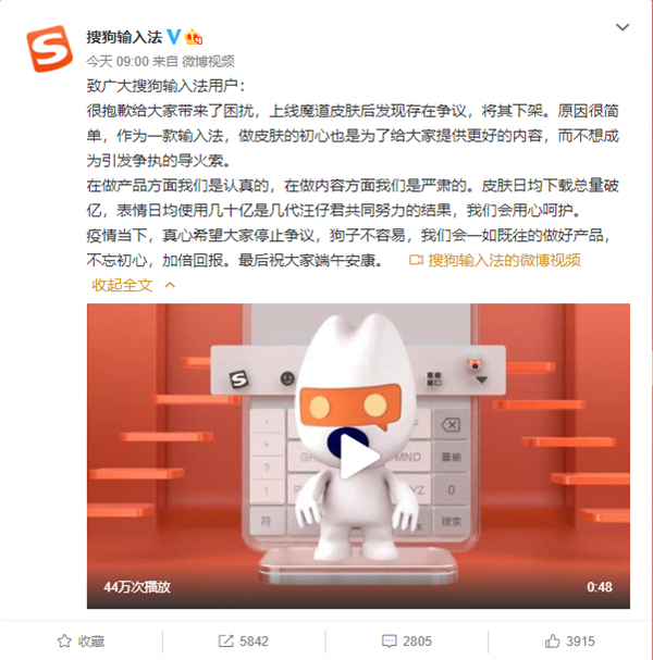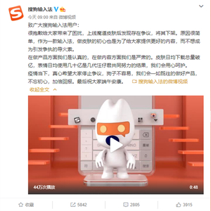 对此,今天搜狗输入法发布了“致广大搜狗输入法用户”,其中透露了下架该皮肤的缘由:不想成为引发争执的导火索。