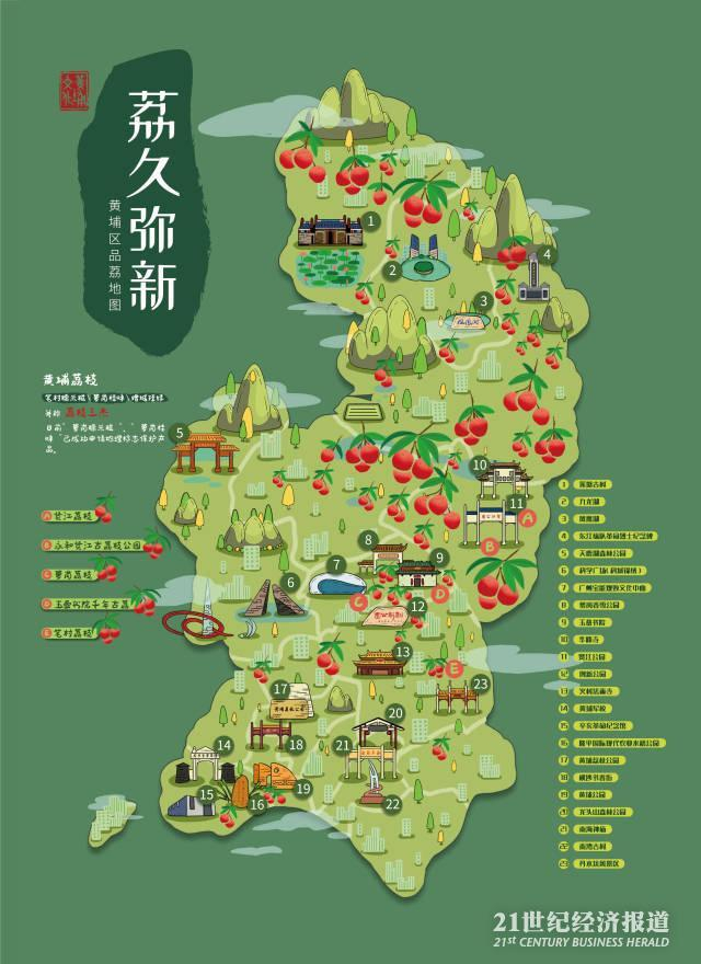 活动现场发布的《手绘黄埔荔枝地图》,完整披露了广州黄埔区现存的主要古荔枝林和荔枝文化历史遗迹。千年时光流转,黄埔传承和积淀了深厚的荔枝文化,通过村民选育嫁接种植,打造了萝岗桂味、笔岗糯米糍、萝岗糯米糍、贤江双肩朱砂红糯米糍、帝顶仙进奉等20多个名优荔枝品牌。在《手绘黄埔荔枝地图》中,这些“百年荔枝”名品分布也有明确的标注,为岭南荔枝保留了珍贵的基因图谱和文化地标。