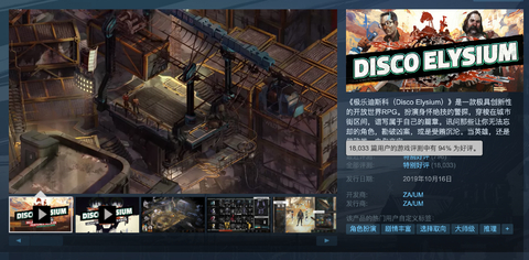 于2019年10月16日在Steam平台发售的《极乐迪斯科》目前共收获了18033条评价,好评率为94%,总体评价为“特别好评”,从Steam的评论区中可以看到大多数玩家对于这款游戏是非常满意的,而大部分的差评都是源于不符合玩家的口味,毕竟 《极乐迪斯科》是一款慢节奏的游戏。