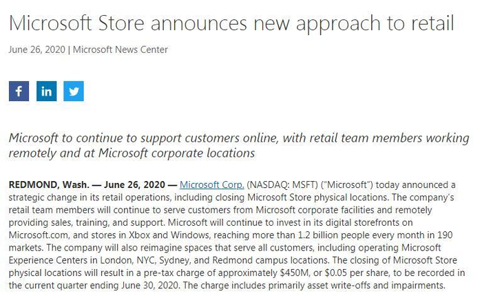6 月26日(美国东部时间),微软以“零售环境的变化、新型冠状病毒以及自身收入模式的变化”为由,宣布将永久关闭全球所有直营零售店铺。