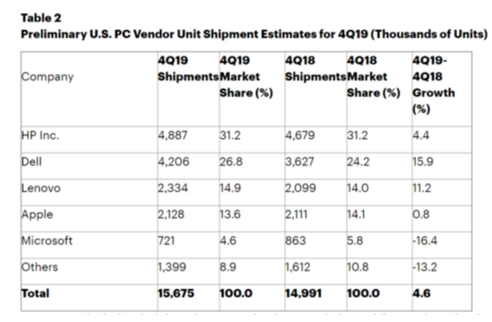 根据技术研究公司Gartner的数据,2019年第四季度,微软仅占美国PC出货量的4.6%,位居第五,较2018年同期5.8%有所下滑。从全球PC市场份额来看,微软未进入前六,被归到“其他”。