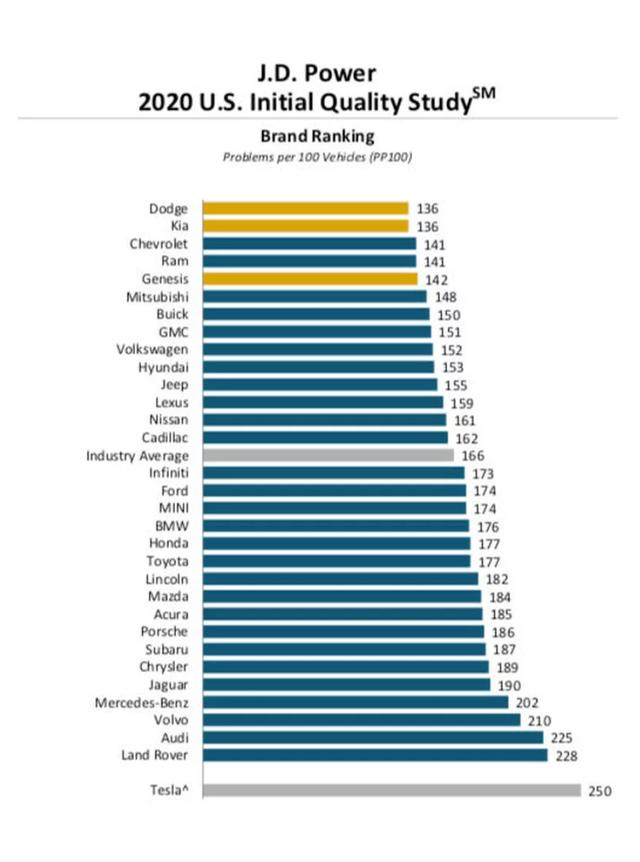 J.D. Power发布2020美国汽车质量报告:特斯拉奔驰等垫底