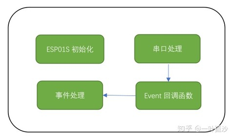 程序主要包括如下4个功能模块:ESP01S初始化、串口处理、Event回调函数、事件处理;串口处理模块包括串口接收和定时器判断一帧数据是否接收完成功能,Event回调函数主要用来通知应用层系统的状态,方便应用层做出相应,比如设备检测到其他TCP Client客户端接入模块,可以控制LED状态,事件处理模块主要包含应用程序大循环,大循环中检测系统事件状态,根据事件状态再大循环中做出响应。
