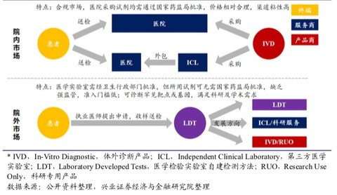 对于这些公司来说,既可以将体外诊断试剂(IVD)卖给医院来获利,也可以向医院或患者提供检测服务获利。在这个过程中主要有两块市场:院内市场与院外市场。患者在医院交费、样本由医院送至与检测公司合办的院内实验室,属于院内市场;患者直接交费给检测公司,样本在中央实验室检测,属于院外市场。相比而言,院外市场准入门槛低,而院内市场的渠道粘性更强。