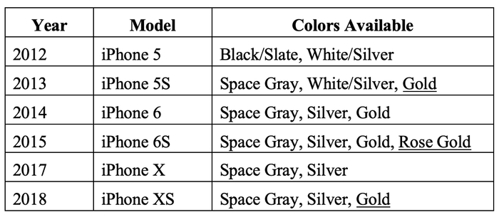 为了解决问题,从iPhone 5S开始,苹果确保每一代“S”系列iPhone都有一个区别于上一代的独特颜色(如下表中下划线所示)。