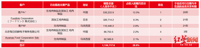 凤祥股份在全球拥有3000名客户所组成的多元化客户群,包括国际知名食品加工商、贸易商以及快餐连锁店。2019年,前五大客户分别是来自中国大区的客户A(一家从事炸鸡业务的领先美式快餐连锁店)、日本大区的 Foodlink Corporation、来自马来西亚的客户B、生鲜电商每日优鲜、来自马来西亚的Ayamas FoodCorporation SdnBhd,合计贡献收入总额的28.9%。