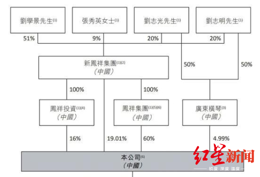 公司是典型的家族企业,由创始人刘学景家族控股。其中刘学景、妻子张秀英、儿子刘志光、刘志明通过新凤祥集团、广东横琴合计持股74.64%,其余为公众股东。
