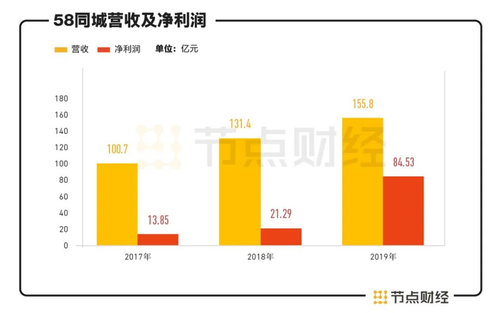 将时间轴拉长,58同城最近3年来营收持续增长,分别为100.7亿元、131.4亿元、155.8亿元;净利润方面,2017年公司实现净利润13.85亿元,2019年增长至84.53亿元。