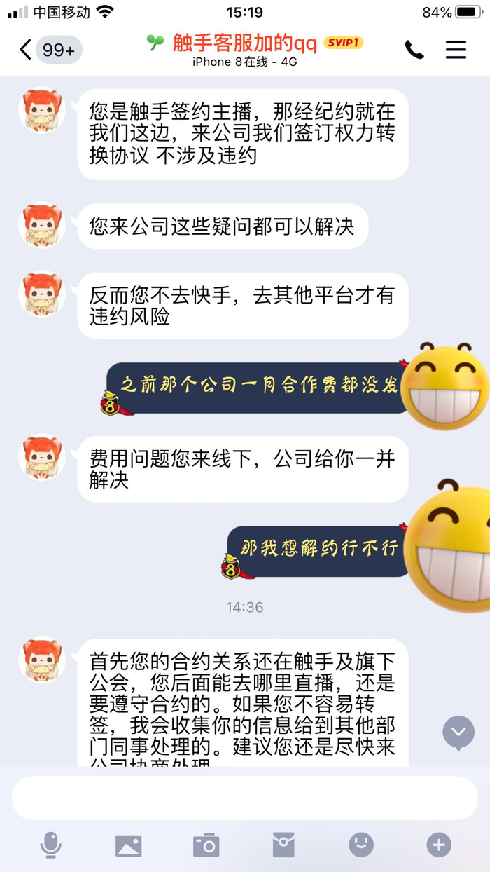 根据主播吴剑杰提供给时代财经的聊天记录显示,触手方面安排了客服与收到通知的主播们对接,对方表示,主播们的合约关系将会转至触手与快手共同投资成立的经纪公会。